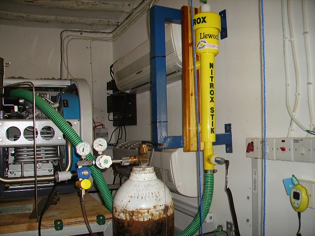 Nitrox Stik, Nitrox Safety Valve and oxygen supply located adjacent to compressor. Nitrox on/off switch and Maxtec oxygen analyzer located on wall.