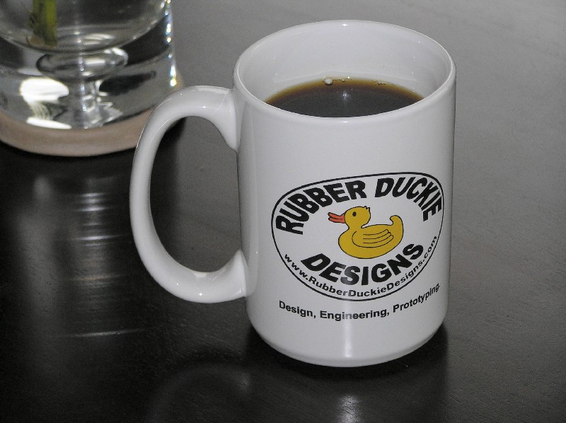 Extra large, 15 ounce, Rubber Duckie Designs logo Coffee Mugs are available for $10 each (includes
